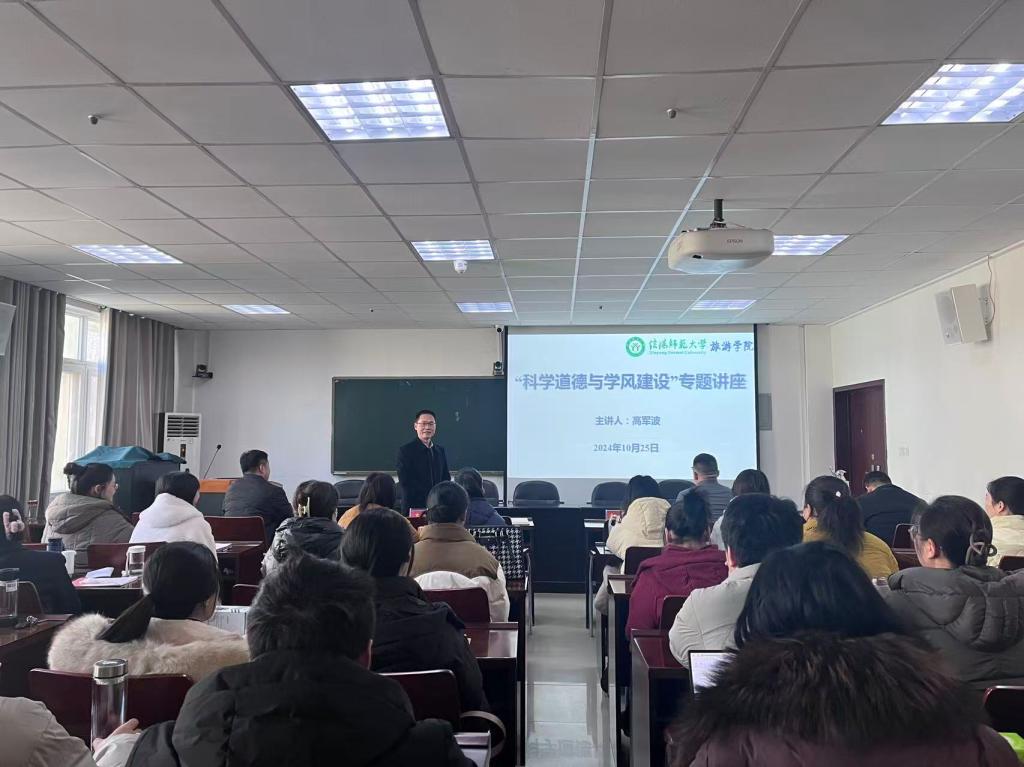 10月25日,旅游学院院长高军波教授在经管楼401会议室以“科学道德与学风建设”为专题给2023级全体研究生作讲座,会议由李明伟博士主持。
